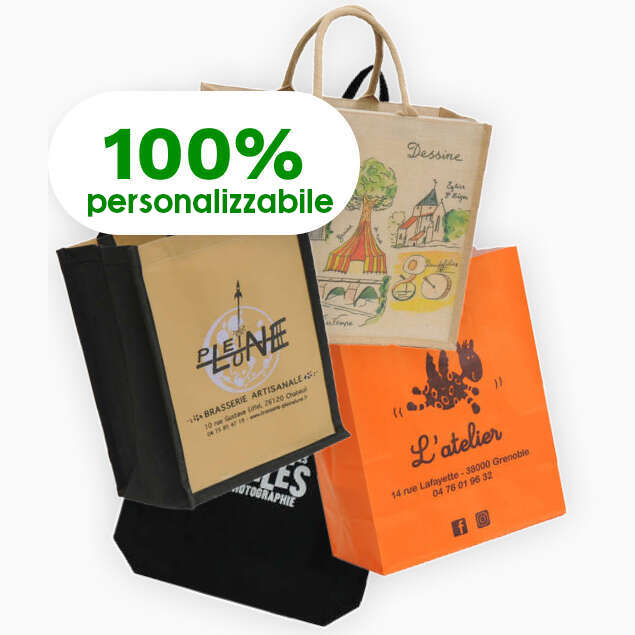 Sacchi, borse e imballaggi in carta, in cartone, in tela di iuta, in tessuto non tessuto, e molti modelli Green completamente riciclabili: scatole di legno, di cartone (anche pieghevoli), sacchi in iuta per bottiglie (con o senza finestra), sacchi in carta Kraft o in versione lusso colorati e/o brillanti, imballaggi per barattoli, bottiglie, regali e prodotti locali...