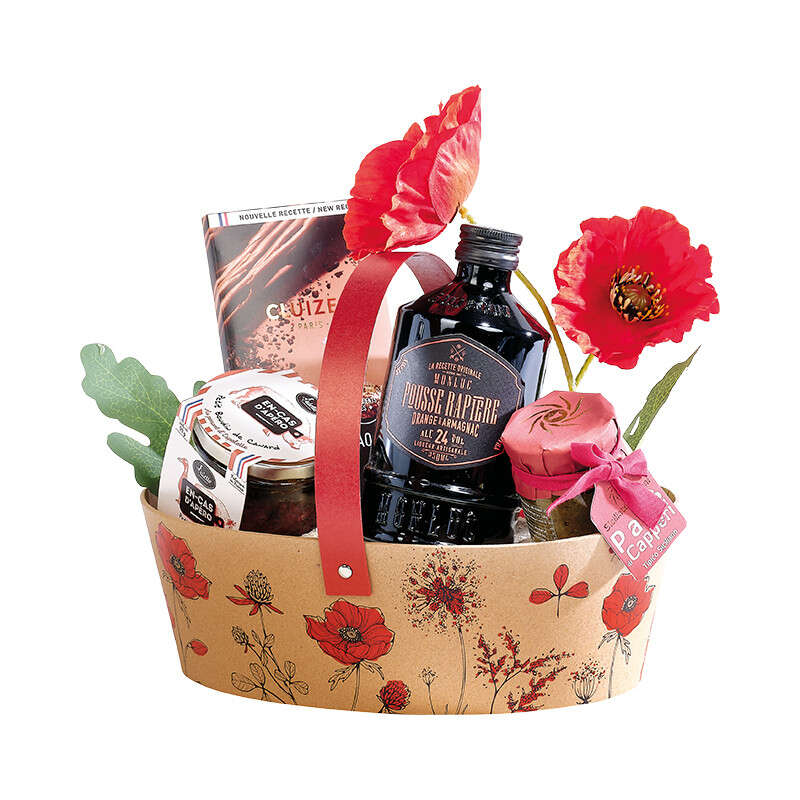 Elegante cestino con motivo floreale rosso e manico, ideale per creare raffinati cesti regalo.