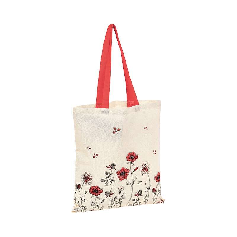 Questa borsa in cotone con motivo floreale rosso e manici robusti è ideale per trasportare i tuoi acquisti con stile.