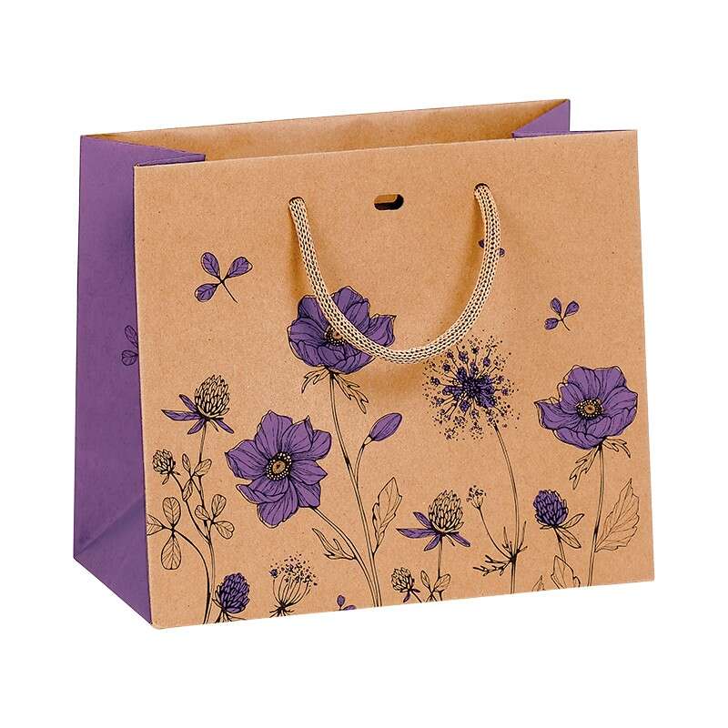 Elegante sacchetto regalo con motivo floreale viola e manici in corda, ideale per valorizzare confezioni e presentazioni.